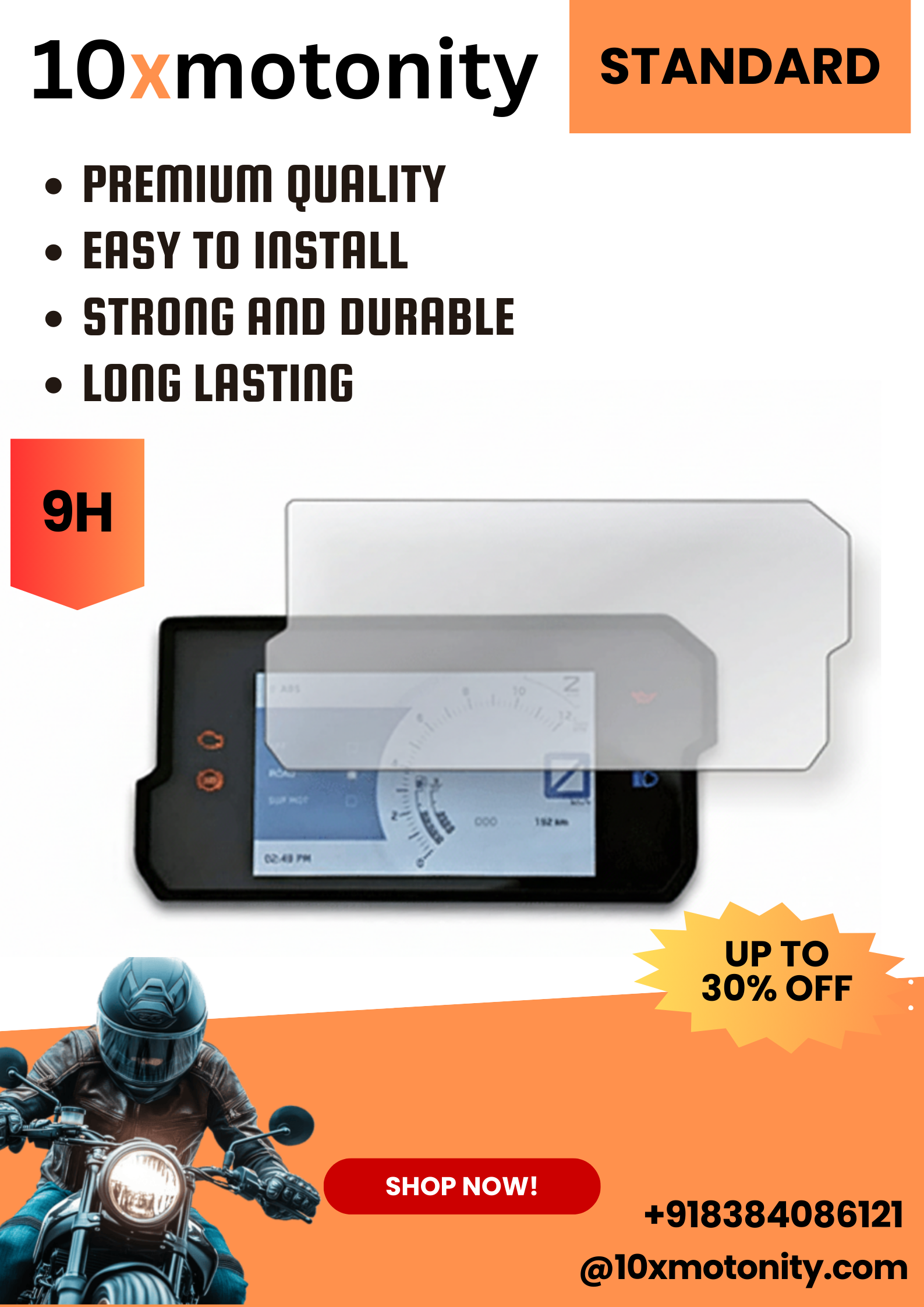 Its 9H hardness rating ensures maximum resistance to daily wear, while the ultra-clear glass maintains perfect visibility of your speedometer, tachometer, and all digital indicators. The protector fits seamlessly on the KTM Duke 390 dashboard, preserving the original brightness and clarity without affecting touch sensitivity.
