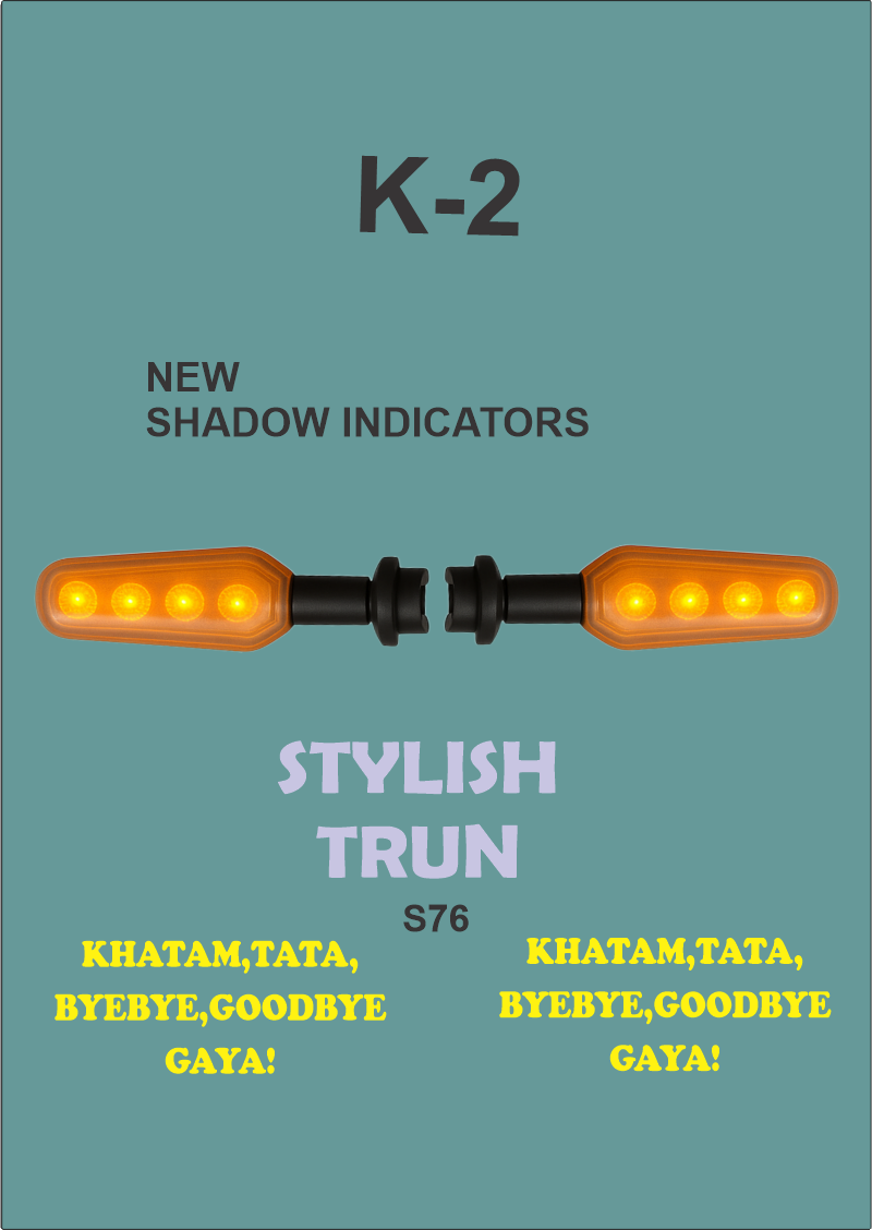 The Shadow Indicator K2 Series combines modern pop culture with expressive style. Its “Khatam Tata Bye Bye, Goodbye Gaya!” projection reflects a fun, confident, and carefree rider’s personality.